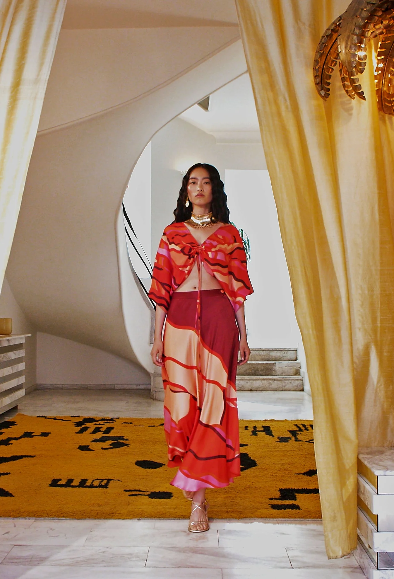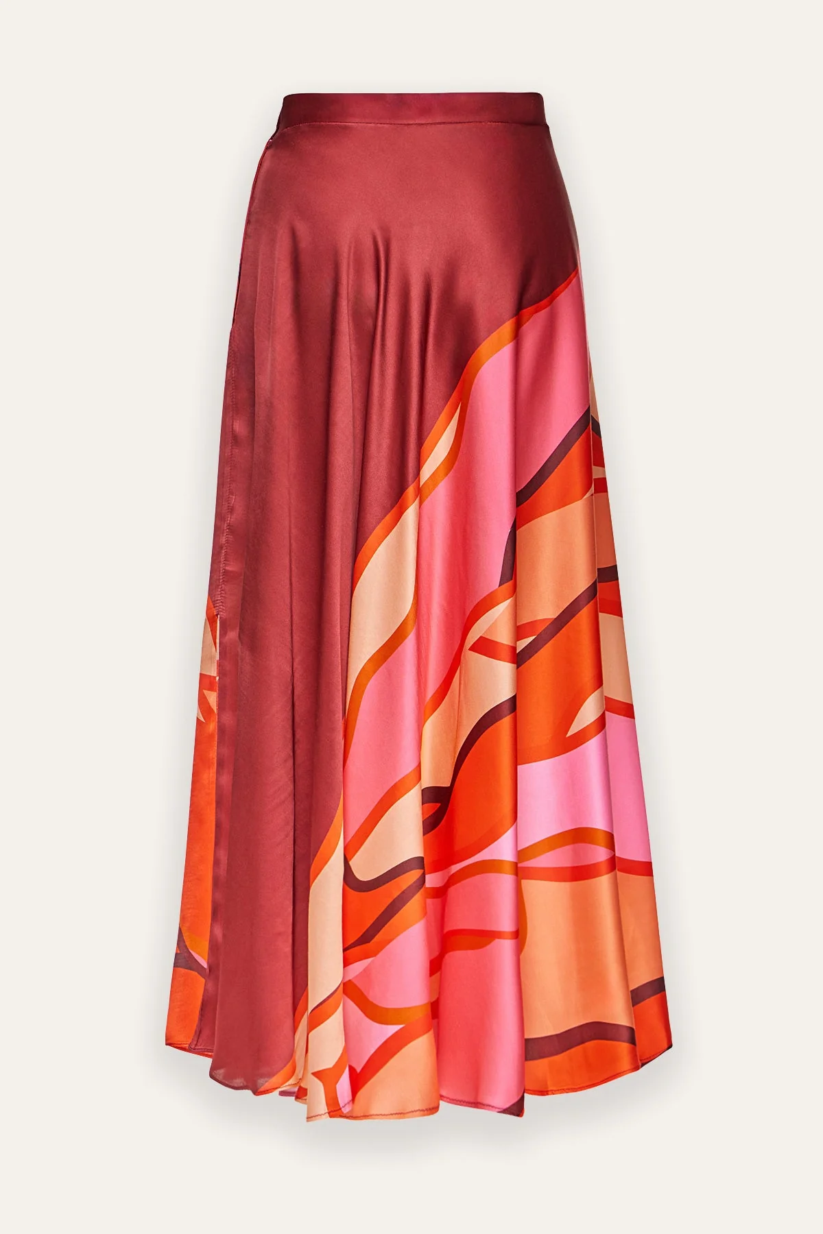 A draped full circle skirt in the ultimate summer hues of Burgundy, coral and red, in our exclusive Minoas red pattern.